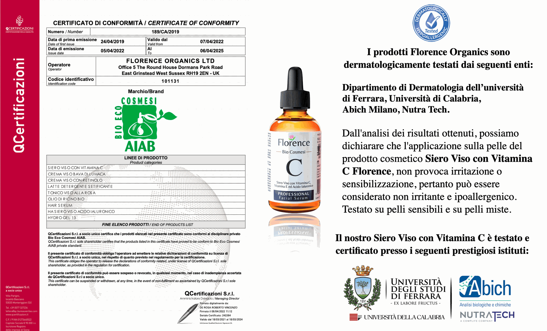 Florence Organics produce cosmetici di altissima qualità, made in Italy e venduti in tutto il mondo. Benvenuti nel mondo Florence Organics, una skincare che offre qualità, valore e risultati straordinari, con formulazioni BIO, senza additivi inutili o test sugli animali, le nostre formulazioni sono realizzate con ingredienti di qualità superiore per fornire prodotti incredibilmente efficaci per tutti i tipi di pelle, ed a prezzi accessibili a tutti.